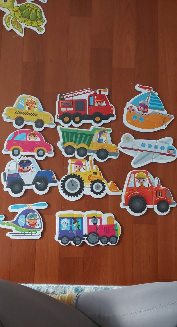 Bu renkli çocuk yapbozu, taksi, itfaiye aracı, tekne, araba, damperli kamyon, uçak, polis arabası, traktör, helikopter ve tren gibi çeşitli araç şekillerini içerir.