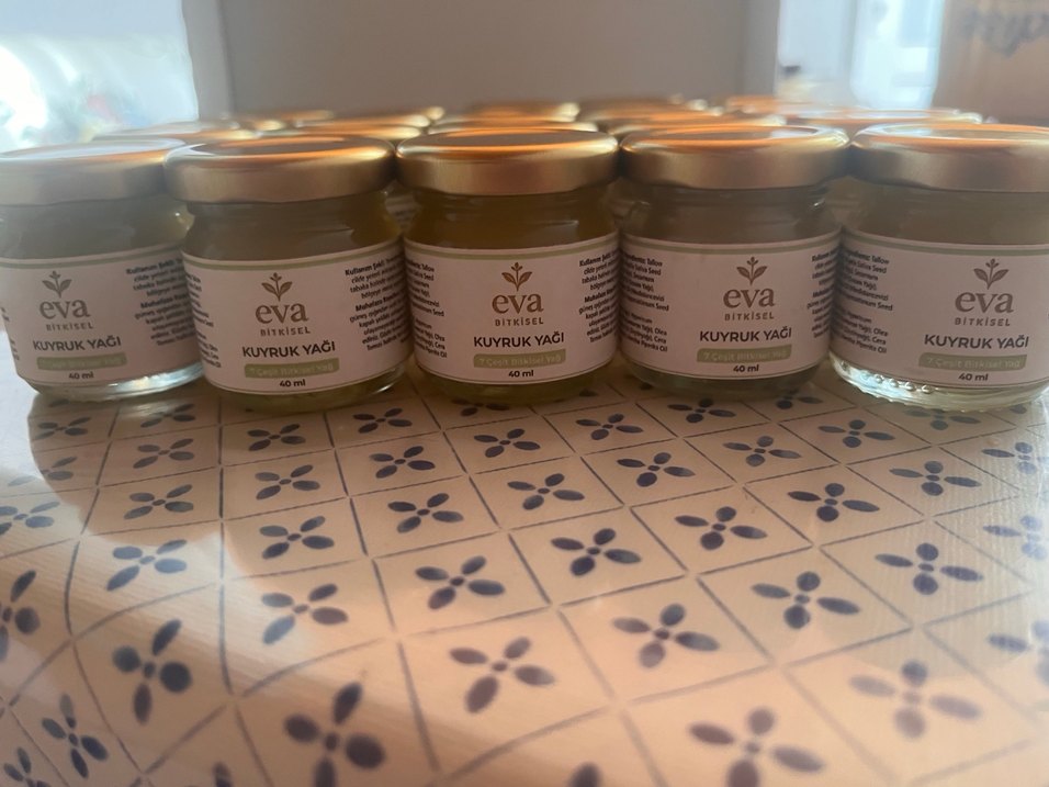 Eva bitkisel kuyruk yağı, 40 ml cam kavanozda, metal kapaklı olarak sunulmaktadır. Topikal kullanım içindir.