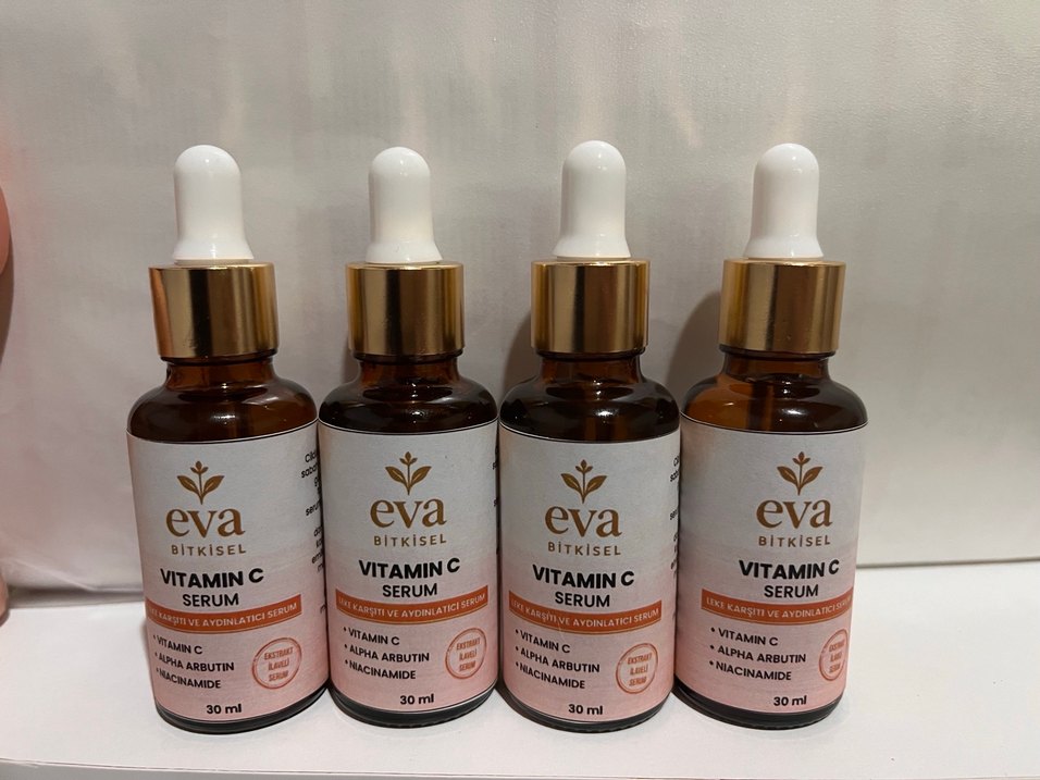 Eva Bitkisel Vitamin C Serumu, C vitamini, alpha arbutin ve niasinamid içerir. 30 ml damlalıklı şişede, cildi aydınlatır ve yeniler.