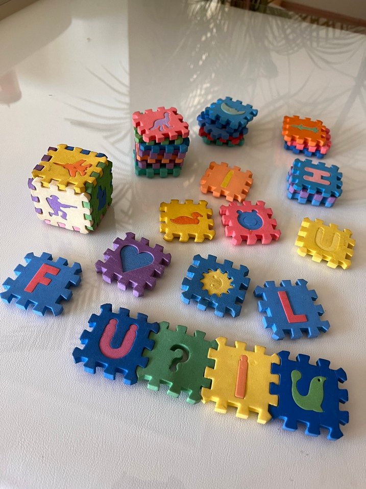 Renkli harf ve şekil parçalarından oluşan çocuk puzzle'ı, öğrenme ve oyun için bir araya geliyor. Eva Puzzle Mats Sünger Puzzle Harfli Rakamlı Mini Boy