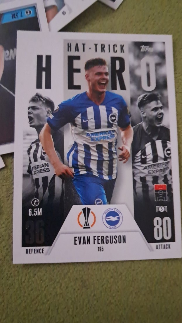 Evan Ferguson'un saldırı ve savunma yeteneklerini gösteren gri ve mavi tasarımlı spor kartı. ⚽