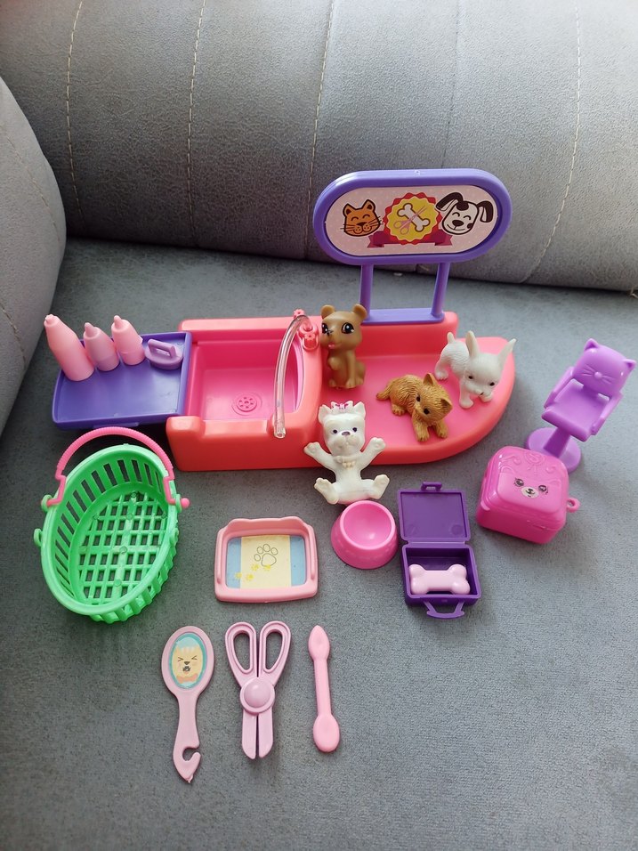 Pastel pembe renkli evcil hayvan bakım seti; küçük araç, hayvan figürleri ve sepet, bakım aletleri, mama kapları gibi aksesuarlar içerir.