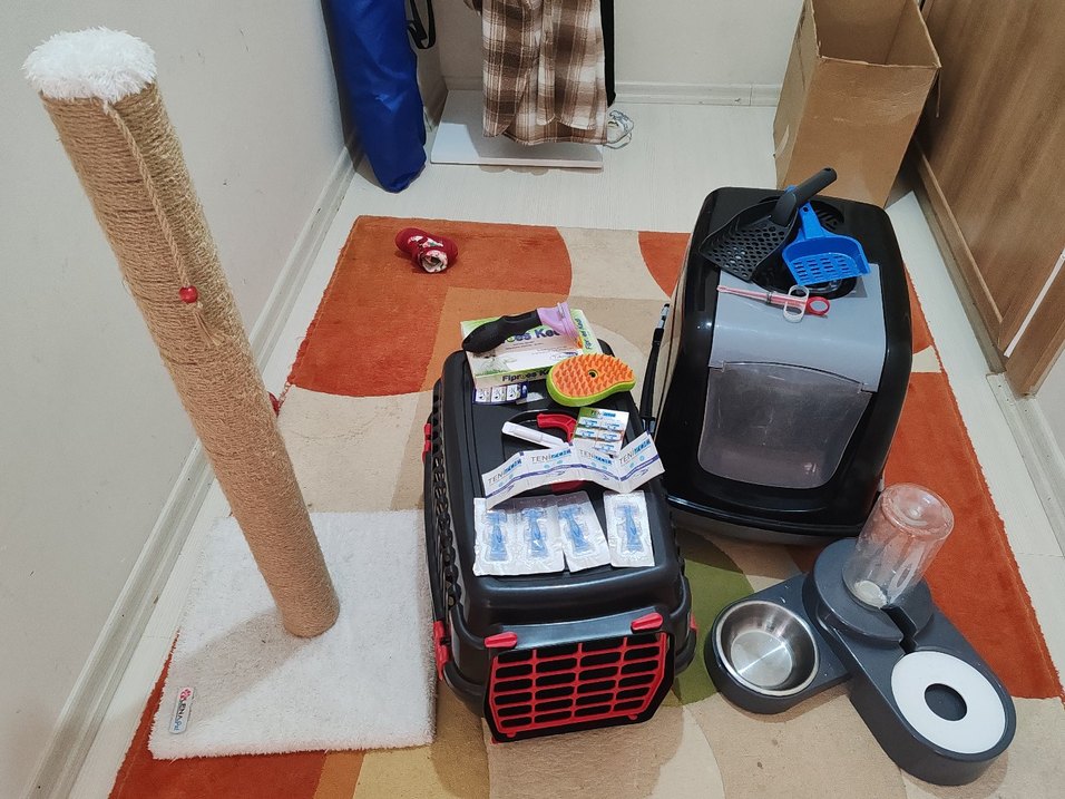 1 adet Kedi taşıma çantası 1 adet Kedi tuvaleti 1 adet 90 cm kedi tırmalama tahtasi 1 adet çelik kaplı kedi mama su kabı 2 adet kürek 6 adet dış parazit damlasi 4 adet iç parazit hapı 3 adet tarak 1 adet kedi şampuanı