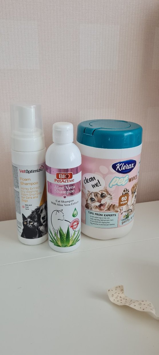 Evcil hayvanlar için köpük kuru şampuan, normal şampuan ve temizlik mendili içeren set. Kullanilmis ürünler ama hâlâ dolu. mendil kuru değil ama yapısı gereği aşırı ıslak değil. set halinde satılık