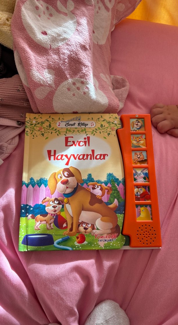 Evcil Hayvanlar adlı eğitim kitabı, evcil hayvanların renkli resimleri ve ses düğmeleriyle etkileşimli öğrenme sağlar.