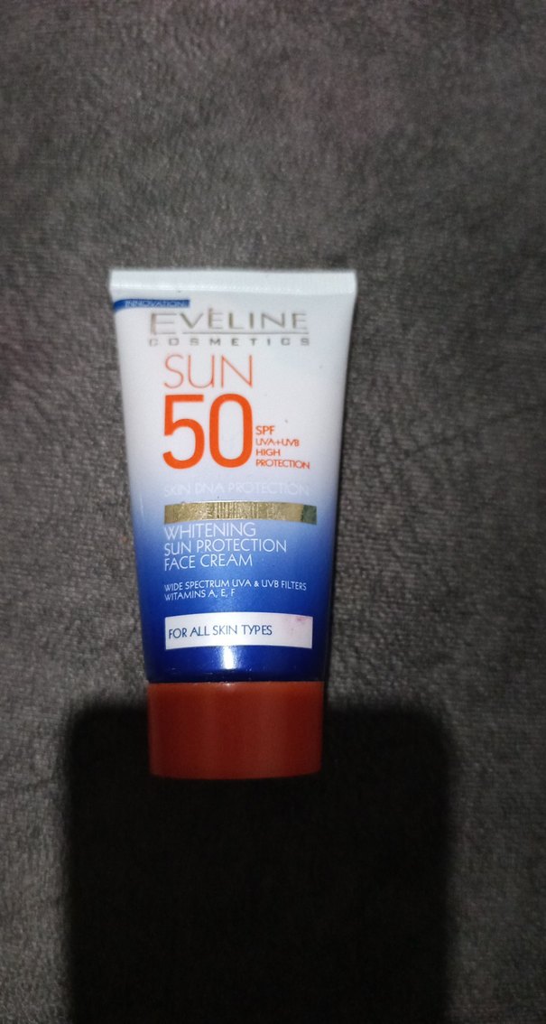 Eveline Sun SPF 50 beyazlatıcı yüz kremi, geniş spektrum UVA ve UVB koruması sağlar. A, E ve F vitaminleri içerir. Tüm cilt tipleri için uygundur.