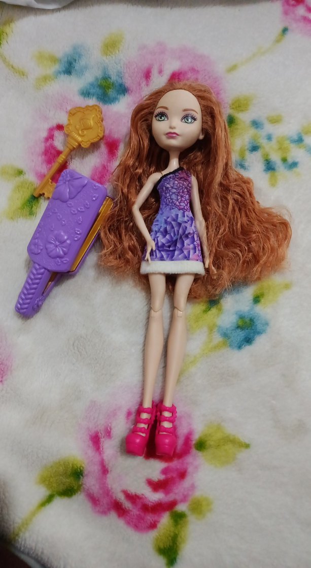 Uzun kırmızı saçlı bebek, mor çiçek detaylı elbise giyiyor. Mor saç fırçası ve altın renkli anahtar aksesuarı ile birlikte.