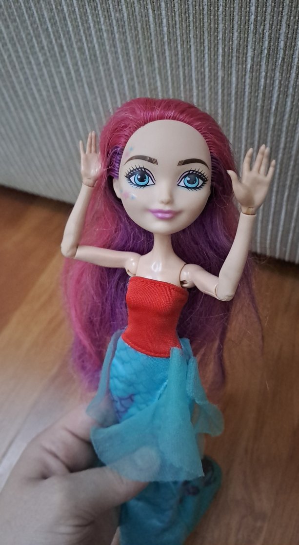 Mor pembe saçlı, renkli bir bebek. Mavi denizkızı tarzı elbiseli. yüzünde deseni var kusursuz.