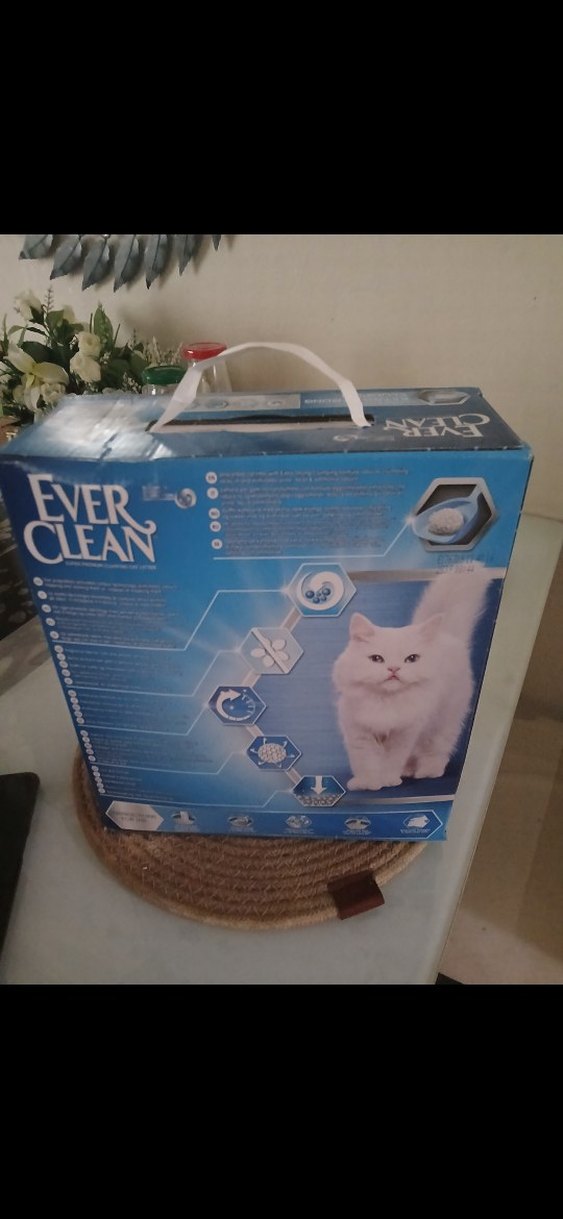 Ever Clean beyaz kedi kumu, kutu üzerinde özellikleri belirtilmiş. Hafif renkli ve taşıma sapı mevcut.