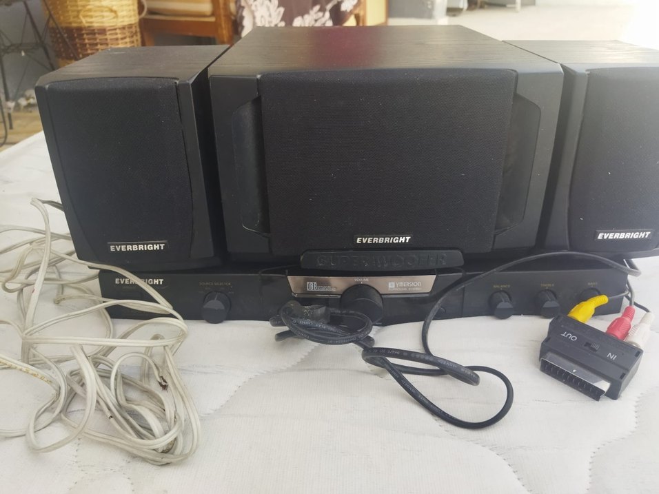 İki hoparlörlü siyah Everbright müzik sistemi, ses kontrol paneli ile birlikte.
