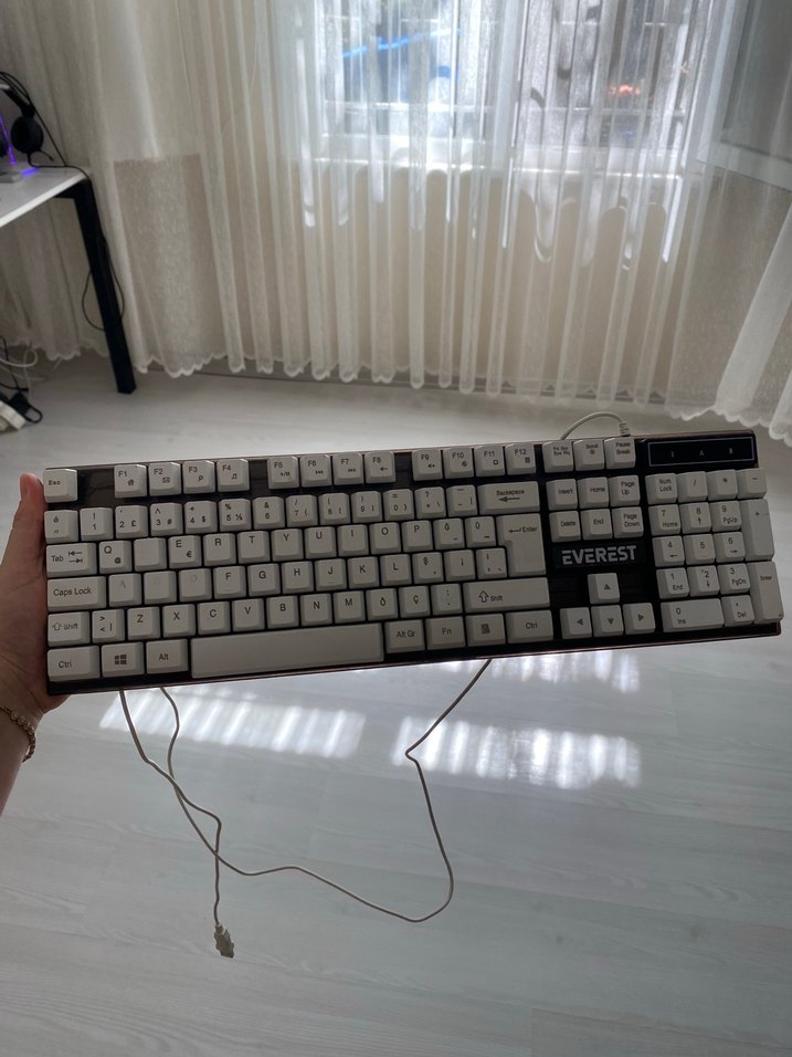 Everest markalı beyaz kablolu klavye, tam düzen ve sayısal tuş takımına sahiptir. USB kablo ile bağlanır ve rahat yazım sağlar. ⌨️