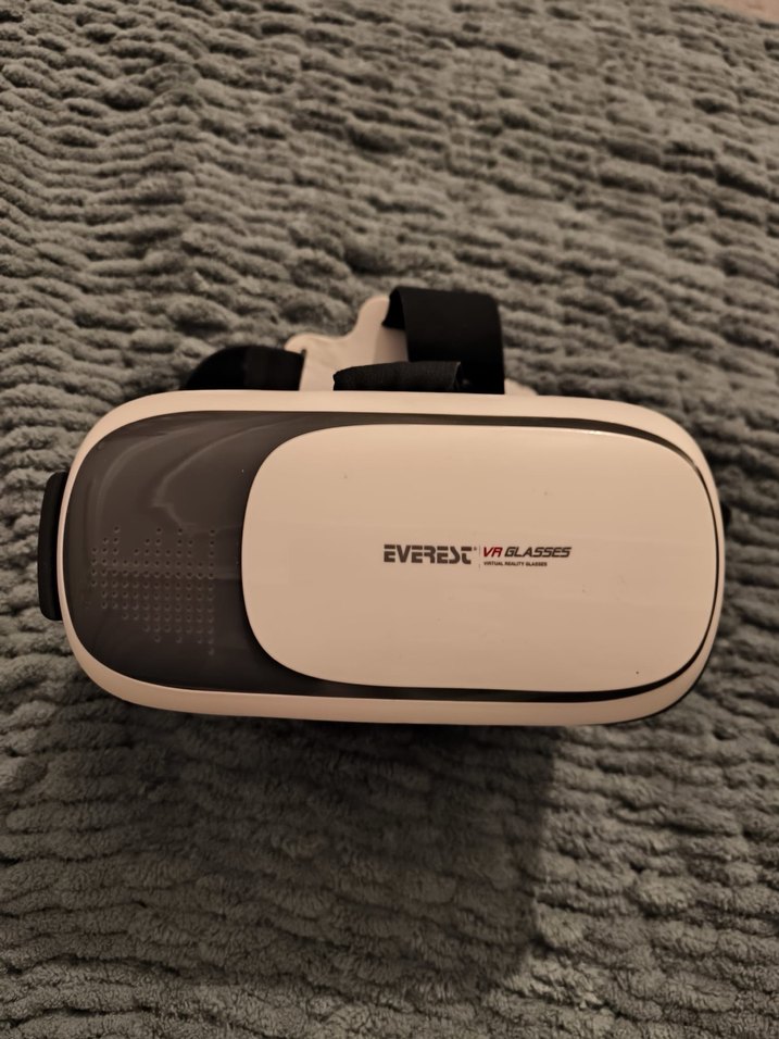 Ayarlanabilir kayışlara sahip beyaz ve gri Everest VR gözlükleri, sanal gerçeklik deneyimi için tasarlanmıştır.