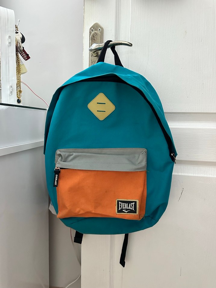 Everlast markalı turkuaz renkli sırt çantası, tokalı ve baskılı ön cepli, yumuşak kumaştan, günlük ve sokak stiline uygun