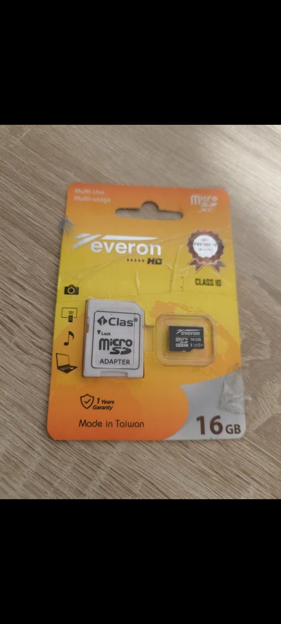 Sarı renk Everon 16GB microSD hafıza kartı, Class 10 hız sınıfı ve adaptör ile birlikte. Tayvan'da üretilmiştir, kamera ve mobil cihazlar için uygundur.