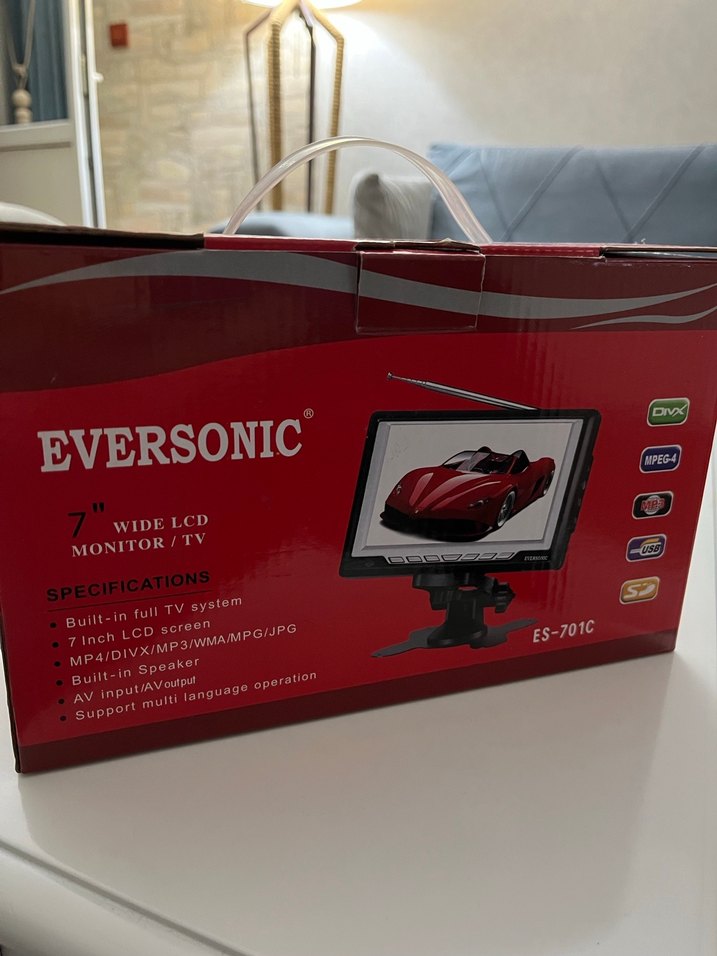 taşınabilir TV hem de LCD monitör işlevi görüyor. •Araç içinde taşınabilir TV/monitör olarak •Kamera veya oyun konsolu ekranı olarak •USB veya SD karttan film, müzik ya da fotoğraf oynatmak için kullanılabiliyor. Ekran Boyutu: 7 inç (yaklaşık 17,8 cm) geniş LCD ekran TV Sistemi: Dahili tam TV alıcısı (antenli olarak yayın izleme) anten girişi vardır alınıp takılabilir Desteklediği Formatlar: MP4, DIVX, MP3, WMA, MPG, JPG Hoparlör: Dahili (built-in speaker) Bağlantılar: • AV girişi / AV çıkışı (AV input / AV output) • USB girişi • SD kart yuvası Dil Desteği: Çoklu dil desteği (Support multi language operation) Model Numarası: ES-701C