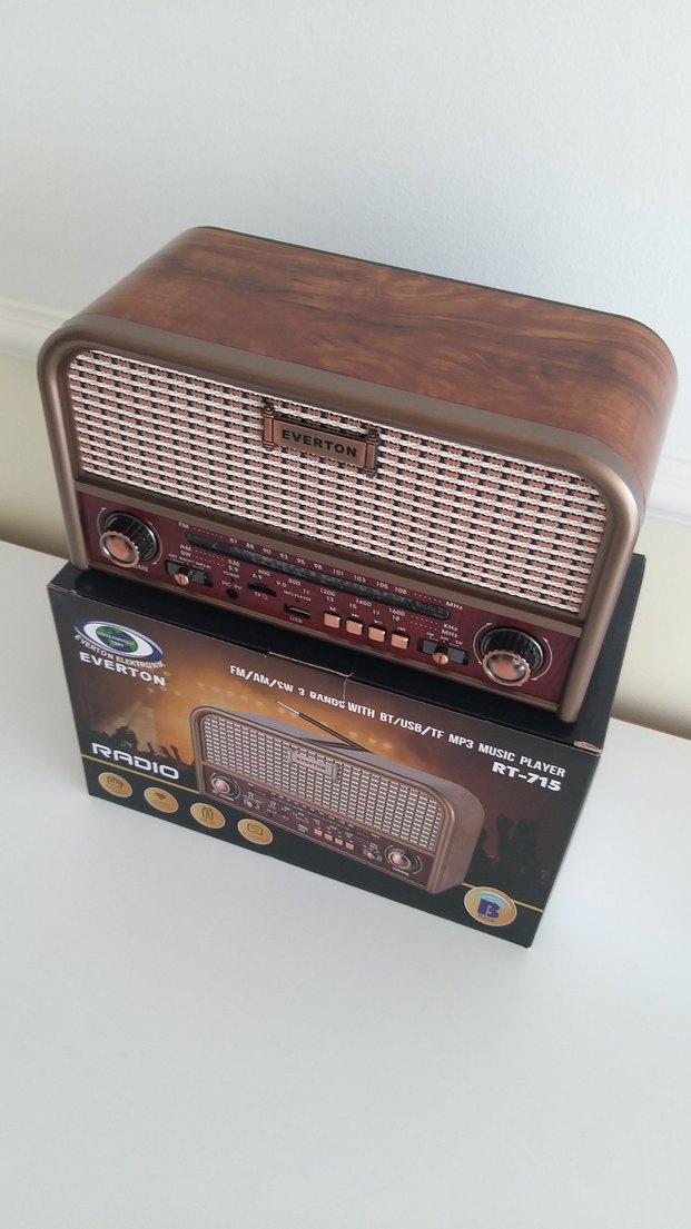 Everton marka retro tarzda, koyu kahverengi ahşap görünümlü müzik sistemi. FM/AM/SW3 bantları, Bluetooth, MP3, USB ve TF desteği bulunur.