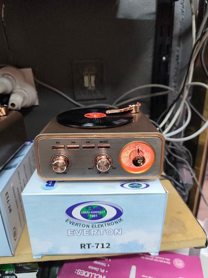 Everton RT-712 müzik sistemi, kahverengi tonlarda renkli tasarıma sahiptir. Üstte plak çalar ve ses ile mod kontrol düğmeleri bulunur.