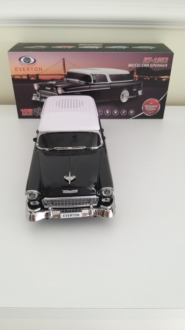 Everton markalı siyah oyuncak araba, müzik hoparlör özellikli klasik tasarıma sahip.