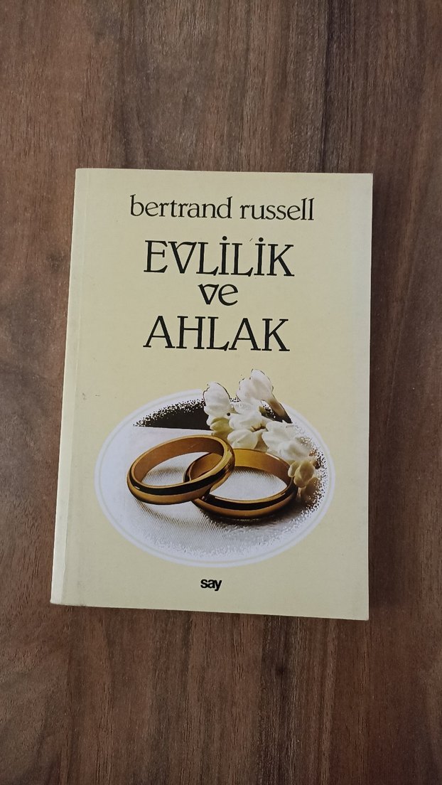 Bertrand Russell'ın "Evlilik ve Ahlak" kitabı, evlilik ve ahlak temalarını inceliyor. Kapakta iki alyans ve beyaz çiçekler yer alıyor.