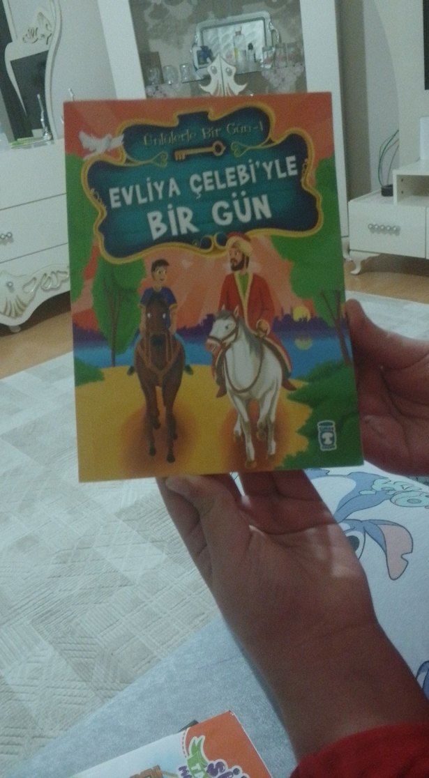 Evliya Çelebi ile Bir Gün adlı çocuk kitabı, at üzerinde karakterlerin yer aldığı renkli çizimlerle tarihi bir hikaye sunuyor. ilk okul çocukları için