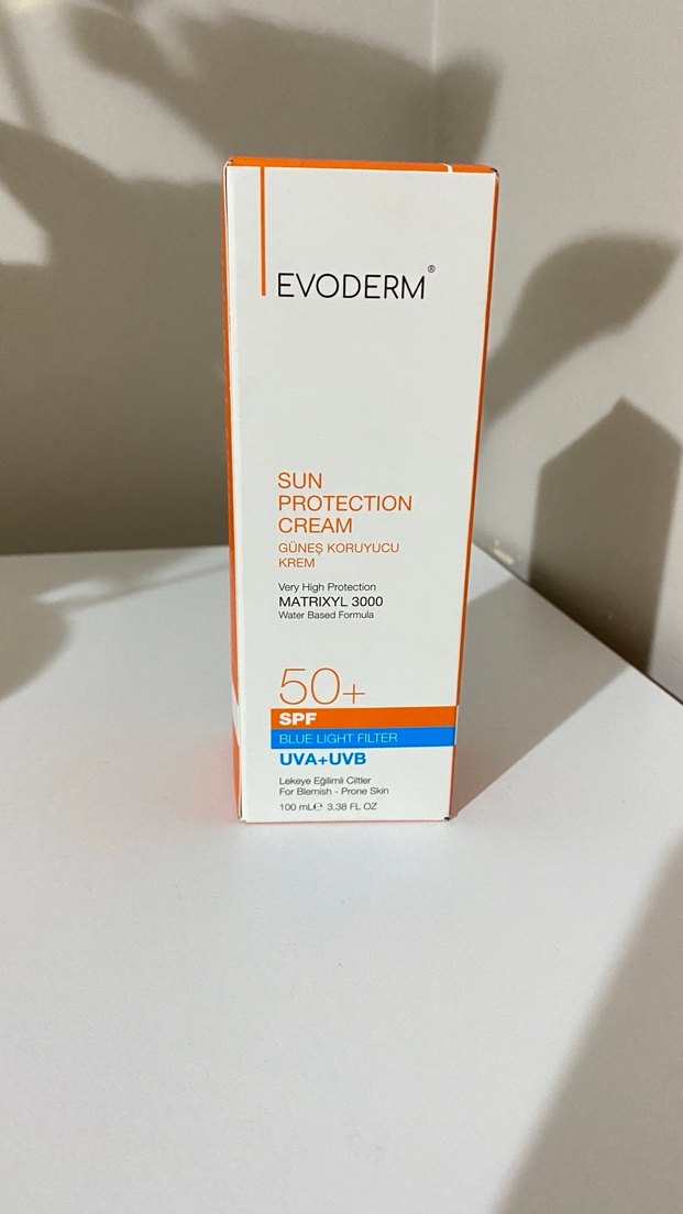 Evoderm güneş koruyucu krem SPF 50+ ile UVA, UVB ve mavi ışığa karşı yüksek koruma sağlar. Matrixyl 3000 içerir, su bazlı formüldür. ☀️