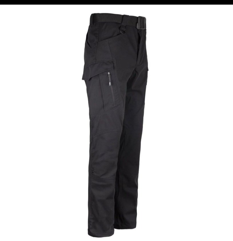 Siyah renkli, kemerli ve regular fit erkek streetwear pantolon. Sentetik kumaştan, orta boyda ve desen içermeyen rahat bir model.