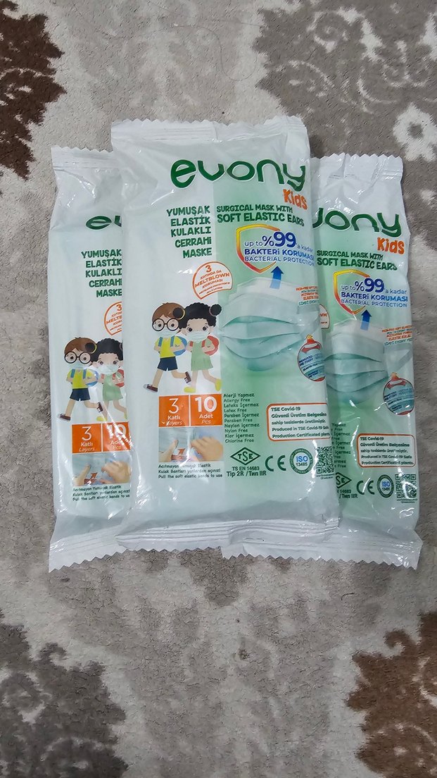 Evony Kids pastel yeşil cerrahi maskeler, yumuşak elastik kulaklı ve %99 bakteriyel koruma sağlar. Her paket 10 maske içerir. (3 paket fiyatıdır)