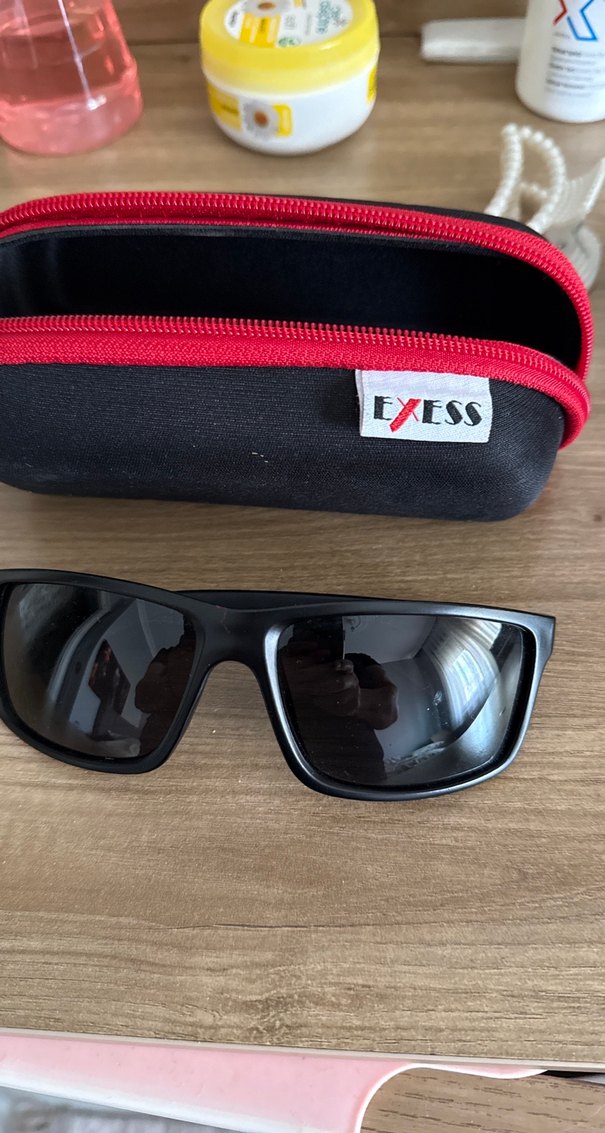 EXESS markalı siyah güneş gözlüğü, fermuarlı kutusuyla birlikte, trend ve rahat athleisure tarzına uygun. ️