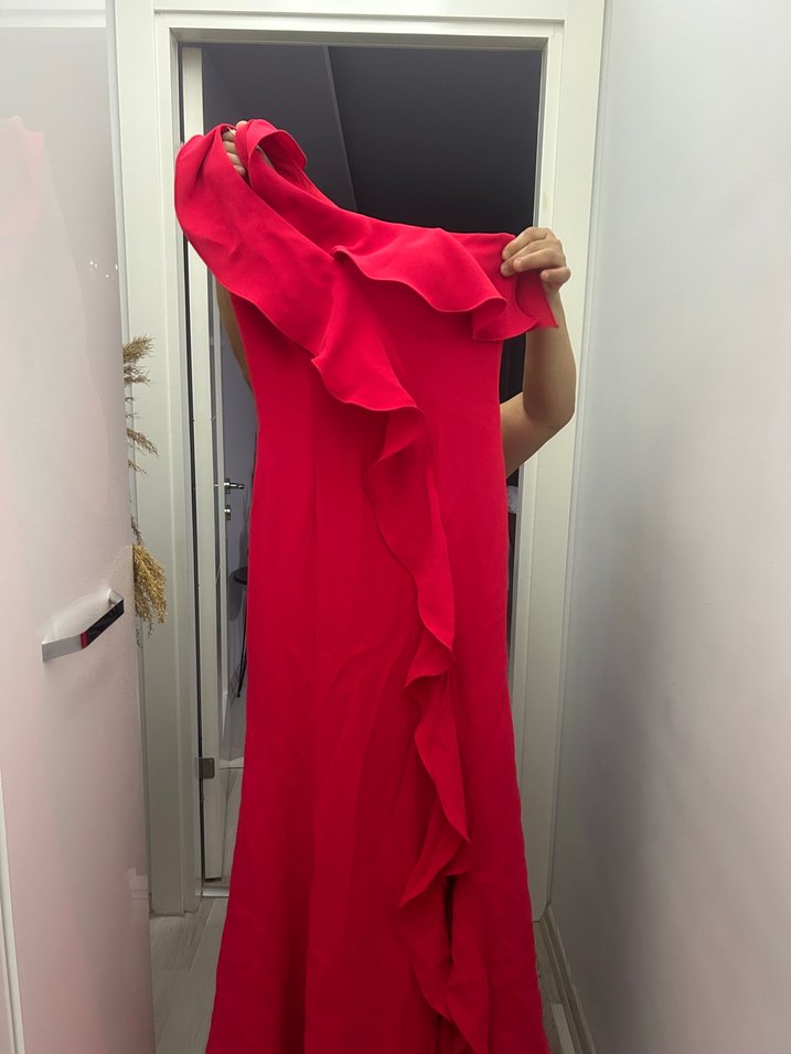 Kırmızı parlak renkte, drapeli ve straplez uzun abiye elbise. Fitted kesimi ile avant-garde ve çağdaş parti tarzına uygundur. Kolsuzdur.