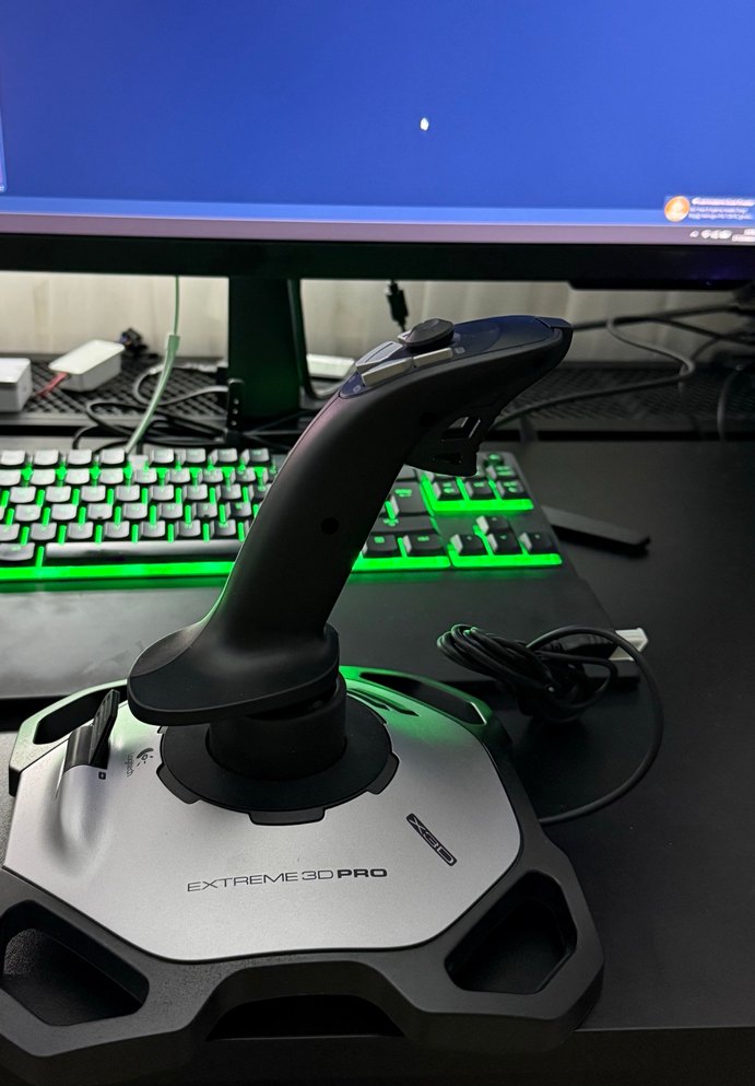 Extreme 3D Pro joystick, koyu yeşil tutma yeri ve sağlam tabanı ile hassas kontrol sağlar. Çoklu tuşlar ve konforlu tutuş sunar.