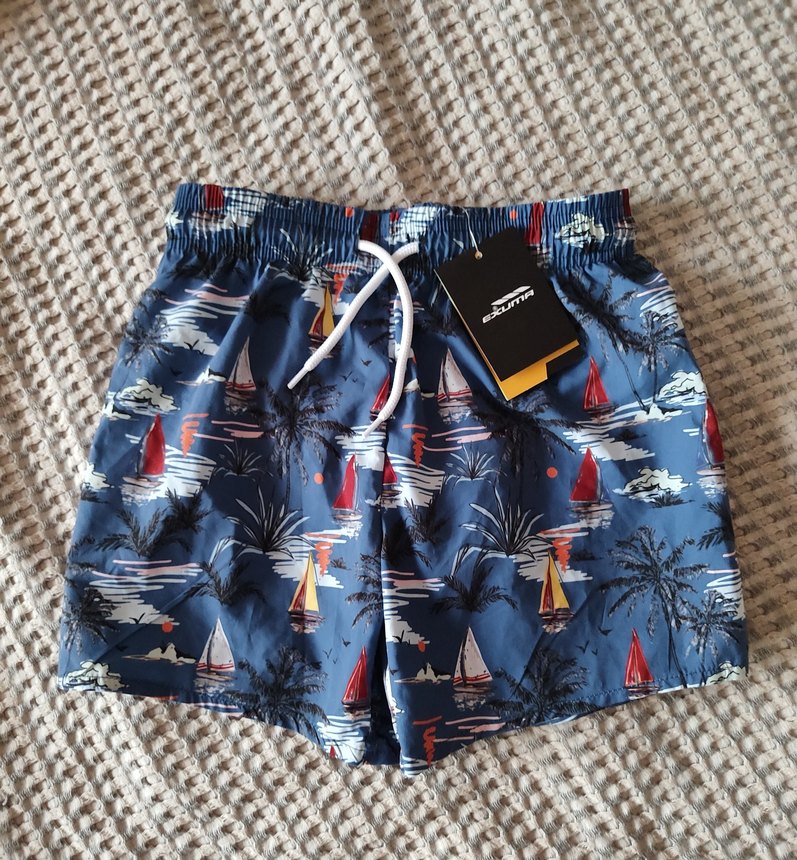 Erkekler için koyu mavi renkli, yelkenli ve palmiye desenli şort mayo. Beyaz bağcıklı elastik bel bantlı 10-11yaş