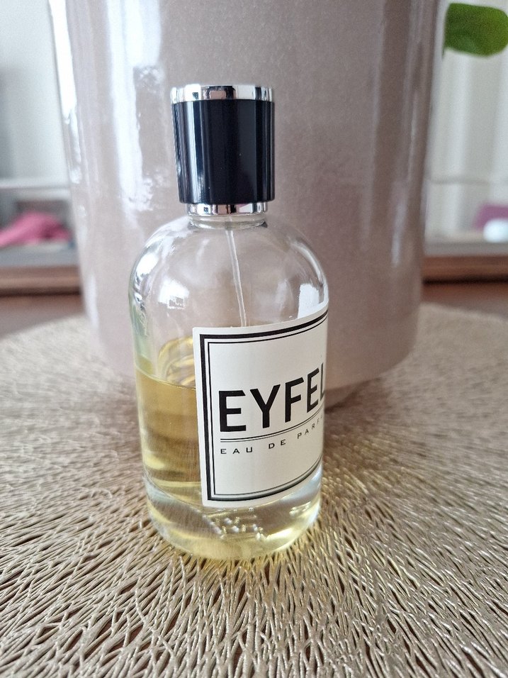 EYFEL M52 erkek parfümü, siyah ve gümüş kapaklı şeffaf cam şişede sunulmaktadır.