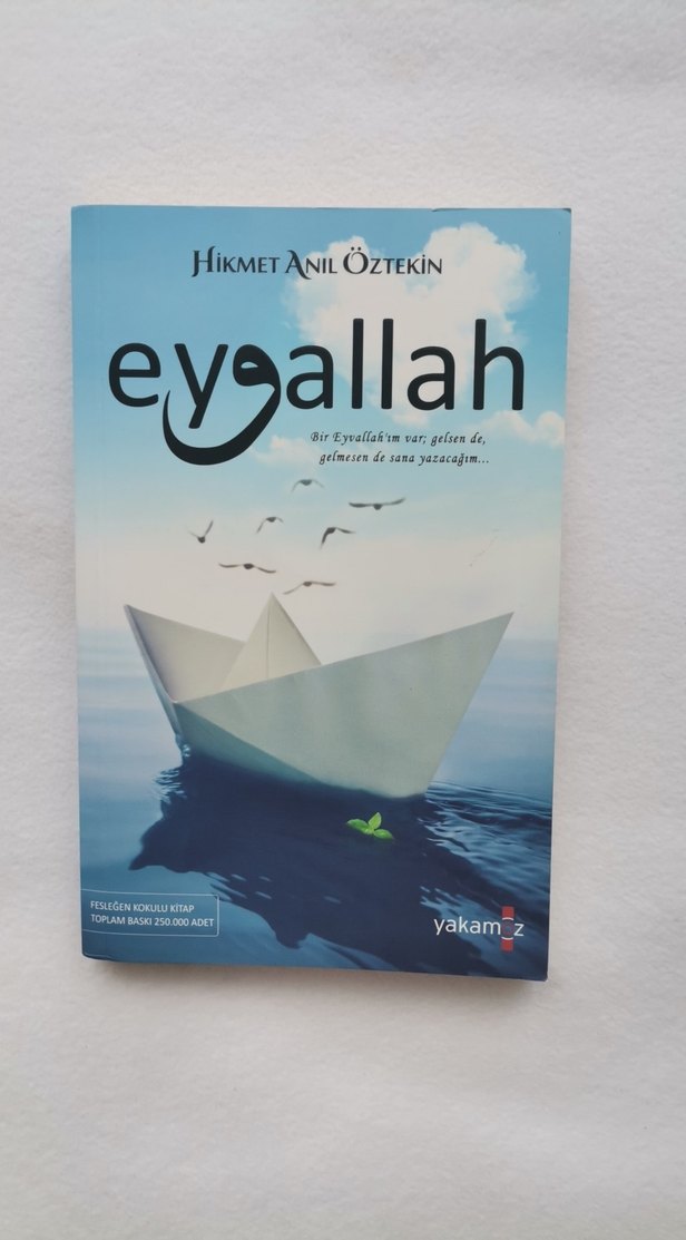 Hikmet Anıl Öztekin'in Eyvallah kitabı, su üzerindeki kağıt tekne ve uçan kuşlarla yolculuk ve düşünceleri simgeliyor. Yakamoz yayınevi. Hiç okunmadı sıfır ayarında tertemizdir.