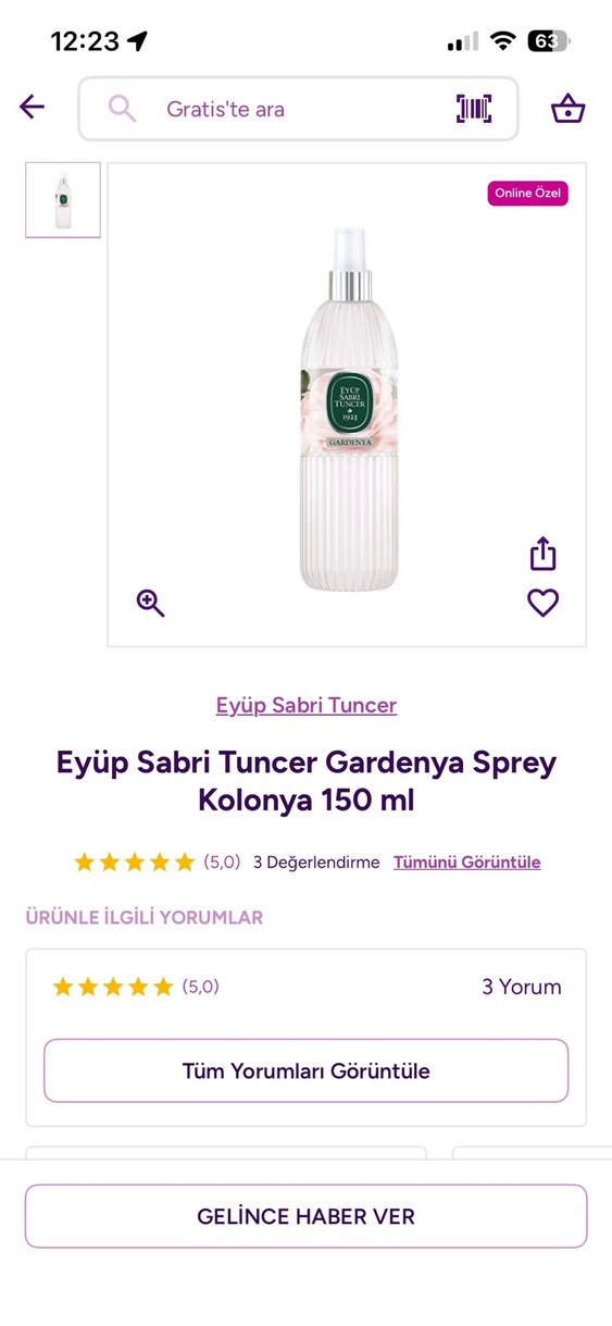 Eyüp Sabri Tuncer Gardenya sprey kolonya, 150 ml şişede taze gardenya kokusu sunar.