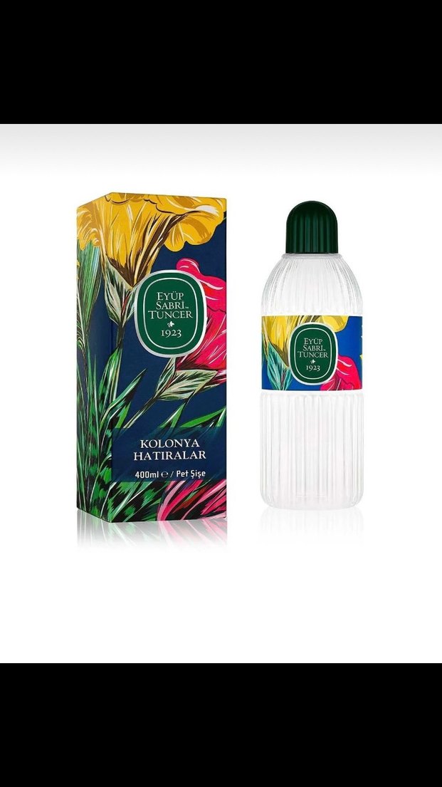 Eyüp Sabri Tuncer Hatıralar kolonyası, 400 ml şeffaf şişede, çiçek desenli kutusuyla sunulur. Ferah bir koku deneyimi sağlar.