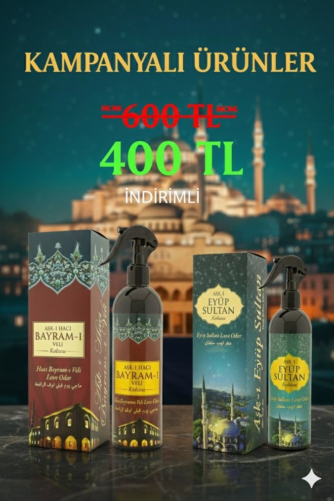 Eyüp Sultan ve Hacı Bayram-ı Veli , alkolsüz oda kokuları kampanyalı fiyatla 400 TL yerine satılıyor. Geleneksel desenlere sahip kutularla sunulur. Ruhunuza dokunacak kokuyu bulmak için profilimize bekliyoruz. " "Bazı kokular sadece burunla değil, ruhla hissedilir... ✨"