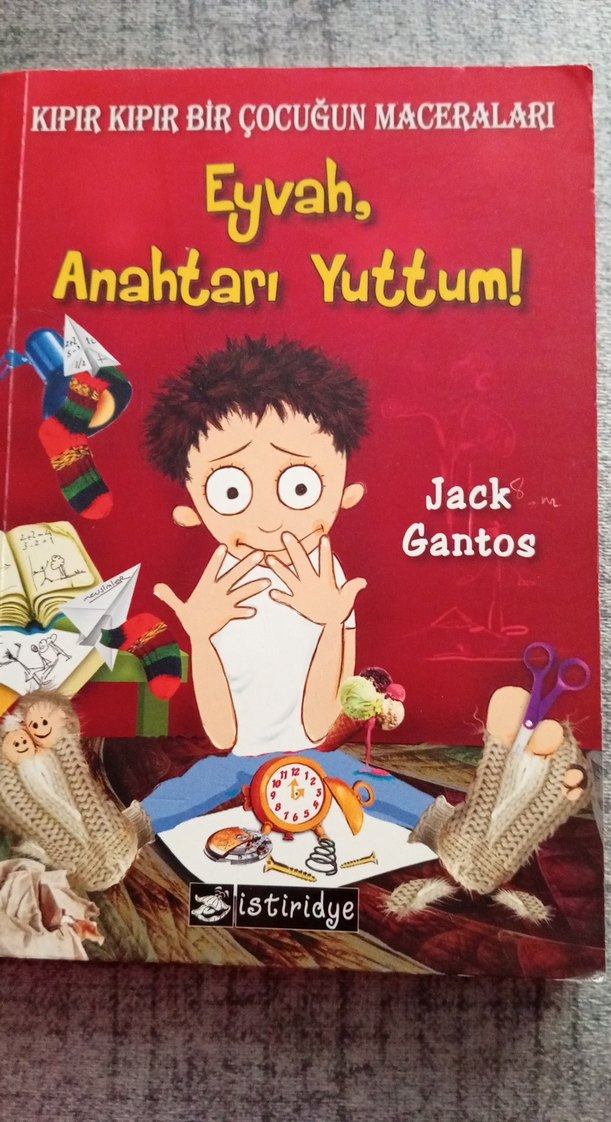 Jack Gantos'un 'Eyvah, Anahtarı Yuttum!' adlı çocuk kitabı, kapağında endişeli bir çocuk ve el işi objeleri bulunuyor.