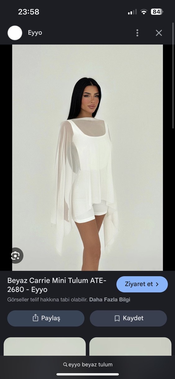 Beyaz mini tulum, kare yaka ve uzun transparan kollara sahip. İpek gibi kumaştan, bol kesim ve minimalist sokak modasına uygun. ✨ Arkadaşım hediye almış ama bana bol oldu beli ve tarzım değil çok açık geldi. Tül kısım arka tarafa da atılabilir sırtı kapatması için Etiketlidir sadece denedim Görselde gösterdiğim bir lekeyle paketi açtım ruh gibi yıkanınca çıkar bence ben etiketi hasar görmesin diye yıkamadım alan kişi isterse yıkar gönderirim yine de