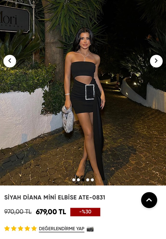Siyah straplez mini elbise, ince askılı ve kemerli, baskılı detaylı. Romantik akşamlar için uygun.