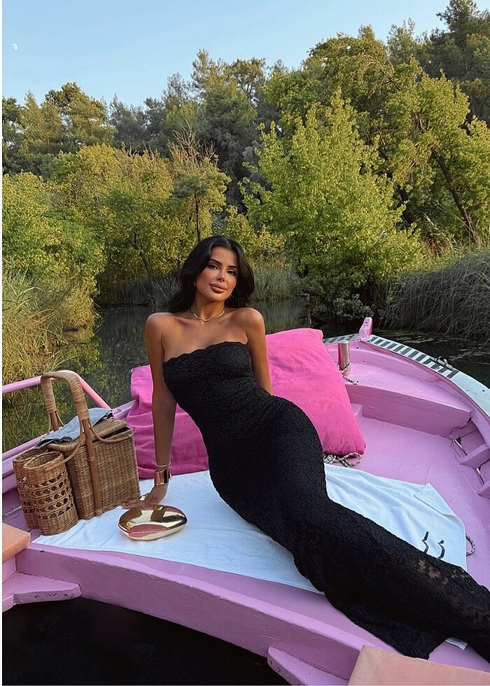 Large beden ama small xsmall medium giyenlere olurken large giyinen biri için dar oluyor. Hiç giyinilmedi kusursuz straplez uzun güpür elbise