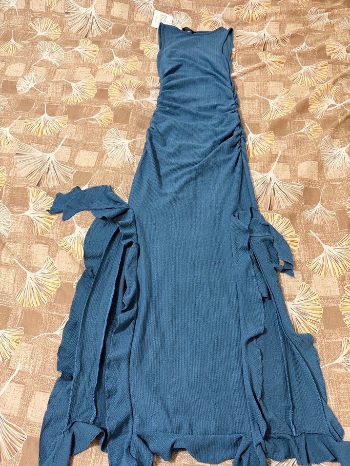 Lacivert renkte, keten kumaştan, straplez yakalı ve drapeli, vücuda oturan uzun kollu elbise. Bohem ve avangart tarz için uygundur.