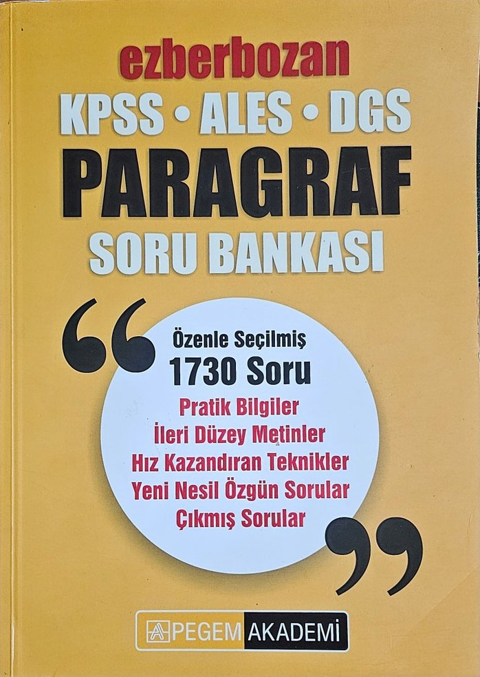 KPSS, ALES ve DGS için özenle seçilmiş 1730 paragraf sorusu içerir. Pratik bilgiler, ileri düzey metinler, hız kazandıran teknikler, yeni nesil özgün sorular ve çıkmış sorular bulunur.