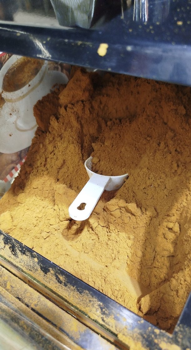 Koyu deve tüyü renginde, ince yapılı toz. Ölçüm için beyaz kepçe içerir.