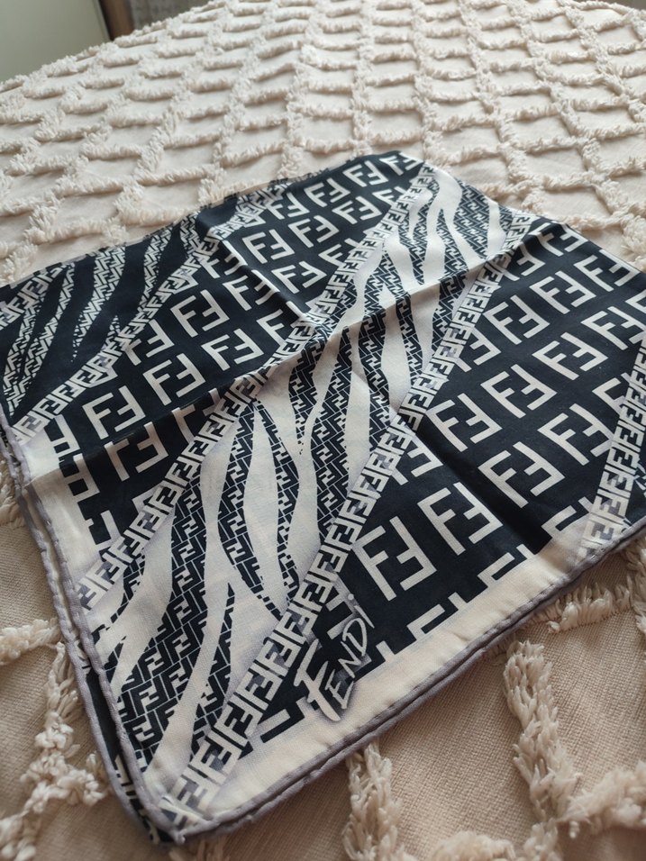 Bohem tarzı, siyah beyaz desenli, sentetik kumaştan, pliseli kadın şalı. Üzerinde F ve E harfleri bulunur. s