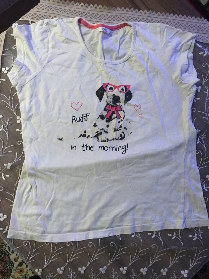 Pamuklu, beyaz renkli, kız çocukları için bol kesim kısa kollu tişört. Üzerinde gözlük takan köpek baskısı ve "Ruff in the morning!" yazısı bulunur
