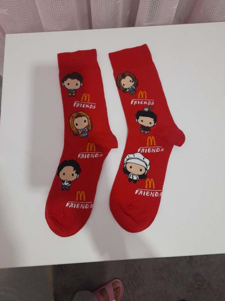 Bay Bayan Çocuk içinde uygundur yumuşak ve sıcak kırmızı polar çorap, renkli baskılı çizgi karakterler ve FRIENDS yazısı içerir. 36 ile 41 arası Yeni ürün 0 etiketi koparılmıştır