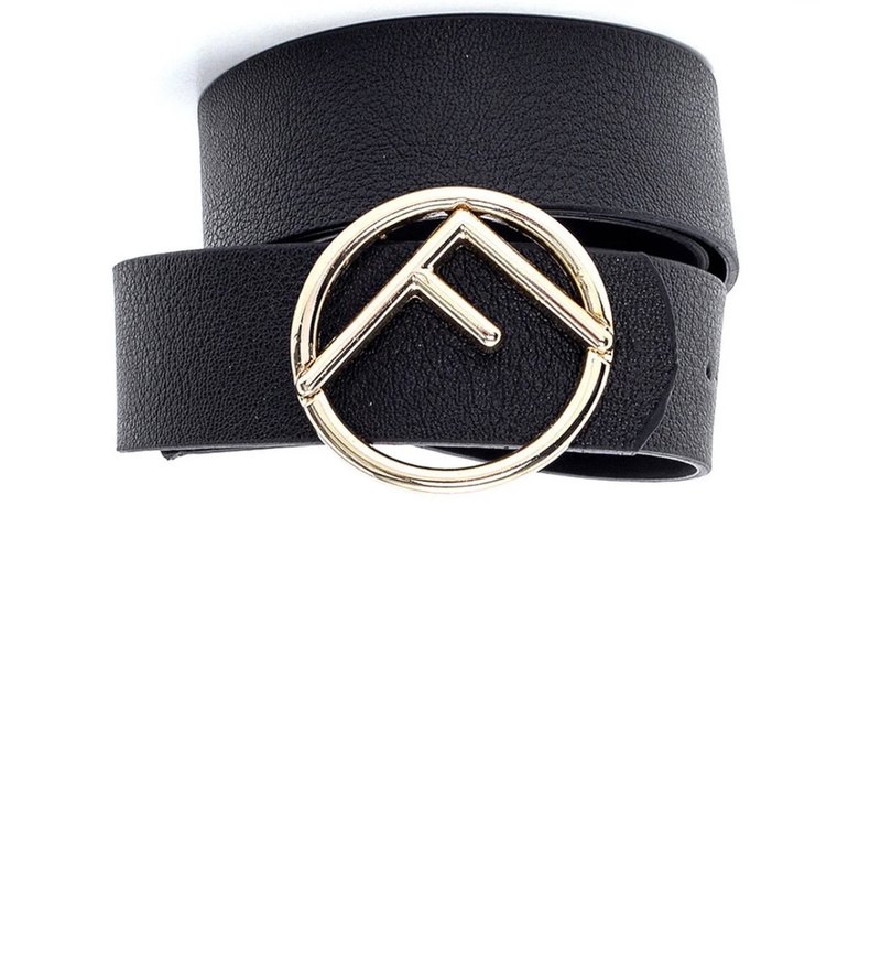 Siyah deri kadın kemeri, altın renk F tokasıyla minimalist ve çağdaş tarz sunar, günlük şıklık için uygundur.