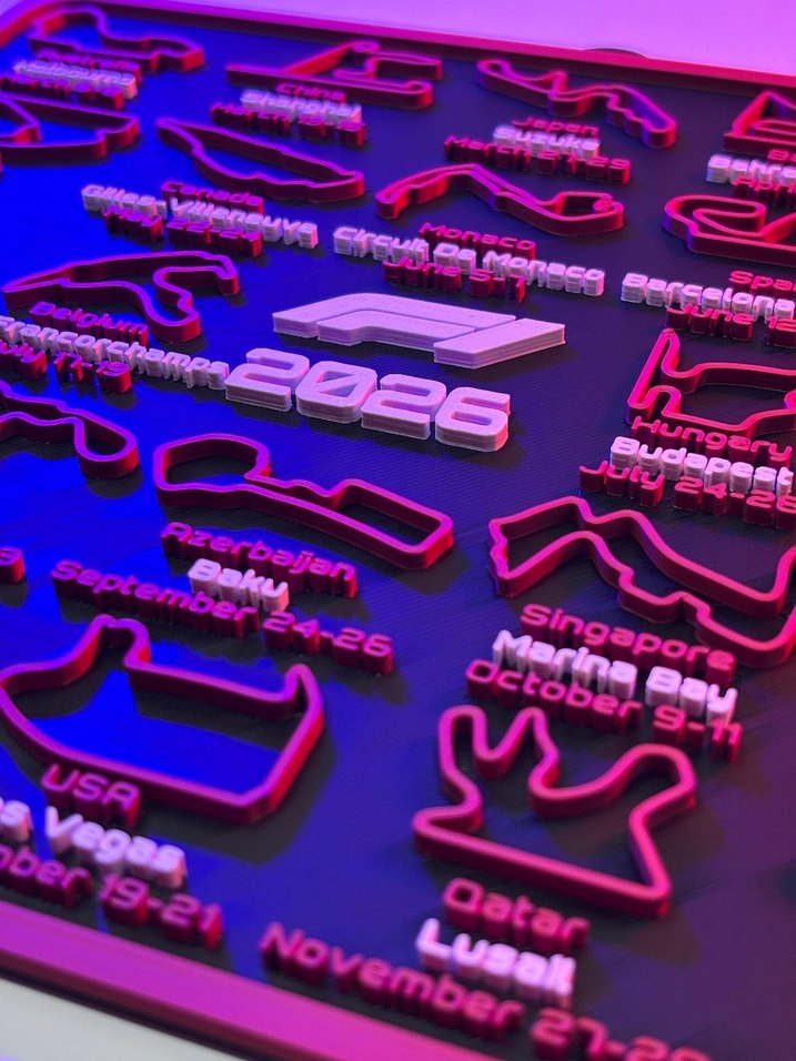 2026 yarış pistleri ve tarihlerini gösteren, mor renk vurgulu renkli puzzle. Qatar ve diğer yerler detaylı şekilde yer alıyor.