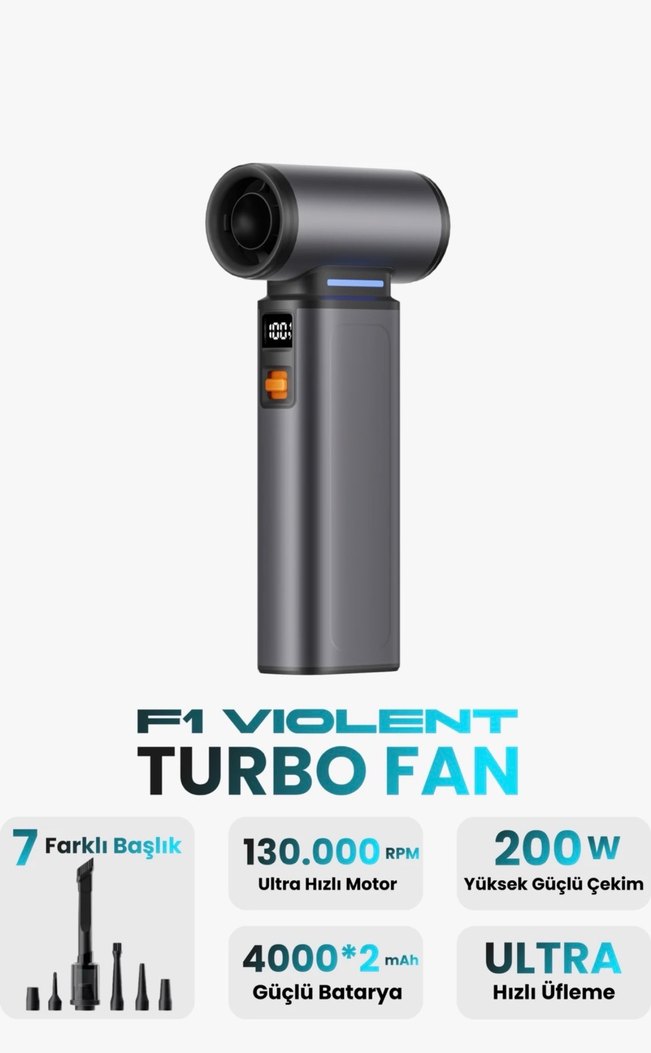 Bu gri turbo fan, 130.000 RPM hızında 200W güçlü motor, 7 farklı başlık ve 4000*2mAh pil kapasitesi ile uzun süreli kullanım sağlar. Yüksek performanslı hava akışı sunar. ⚡