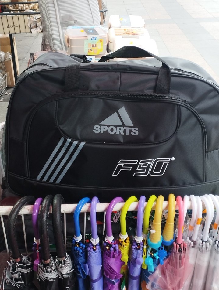 F50 siyah spor çantası, fermuarlı ön cepleri ve SPORTS baskılı deseniyle dikkat çeker. Sokak tarzı ve kullanışlı depolama sunar. ️♂️